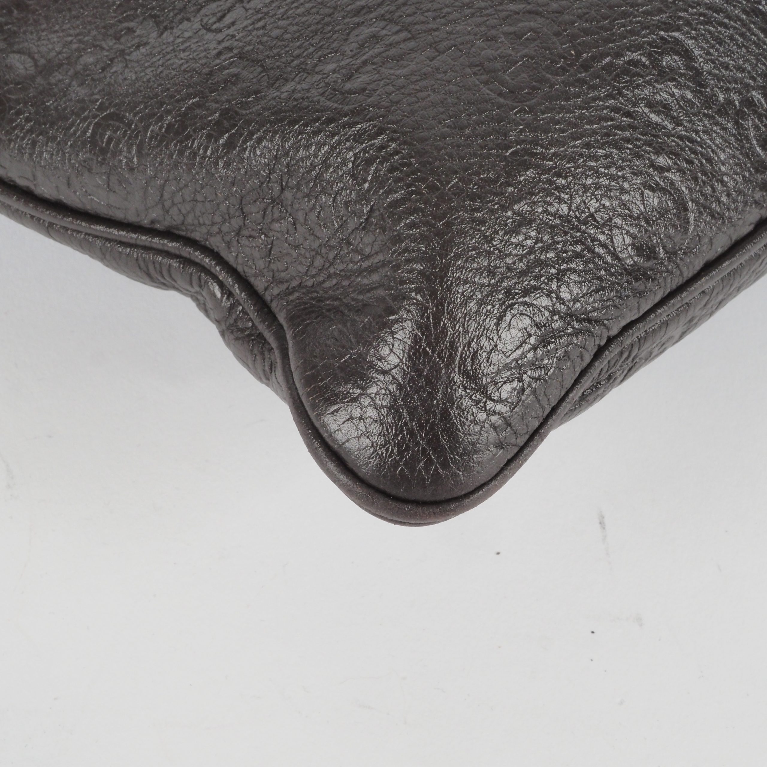 This stylish messenger shoulder bag was made in Italy from embossed leather. The bag is in good used condition with minor signs of wear. It is clean and odor-free inside and out.