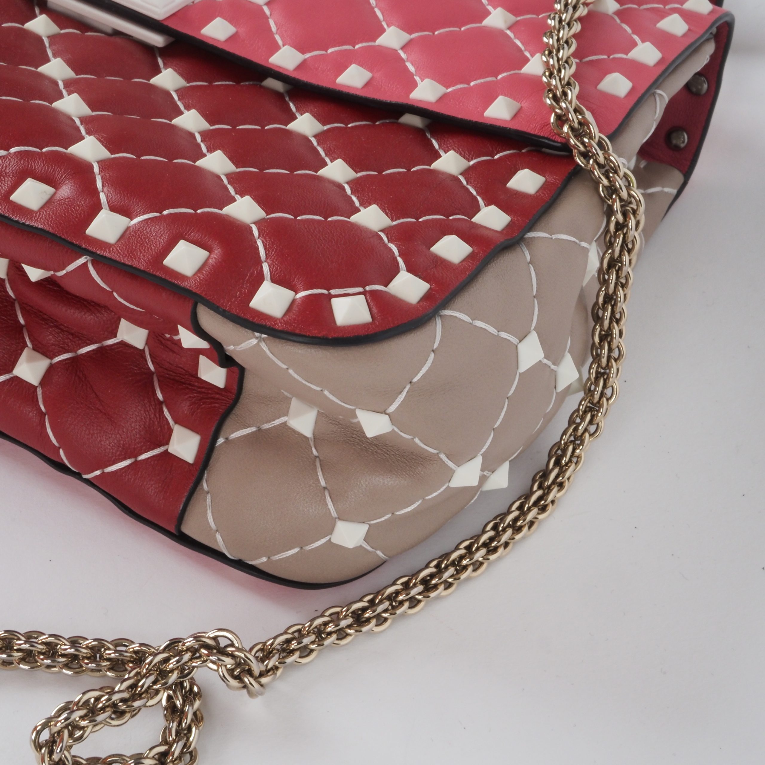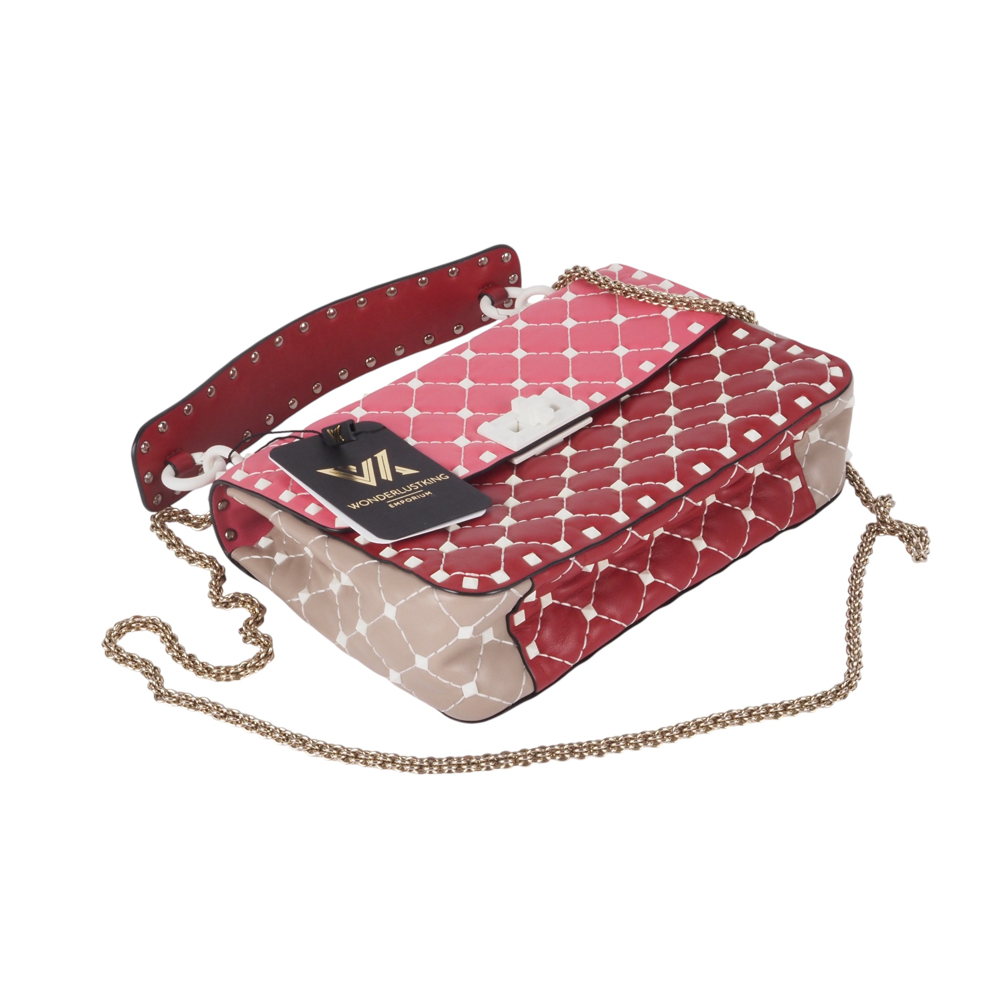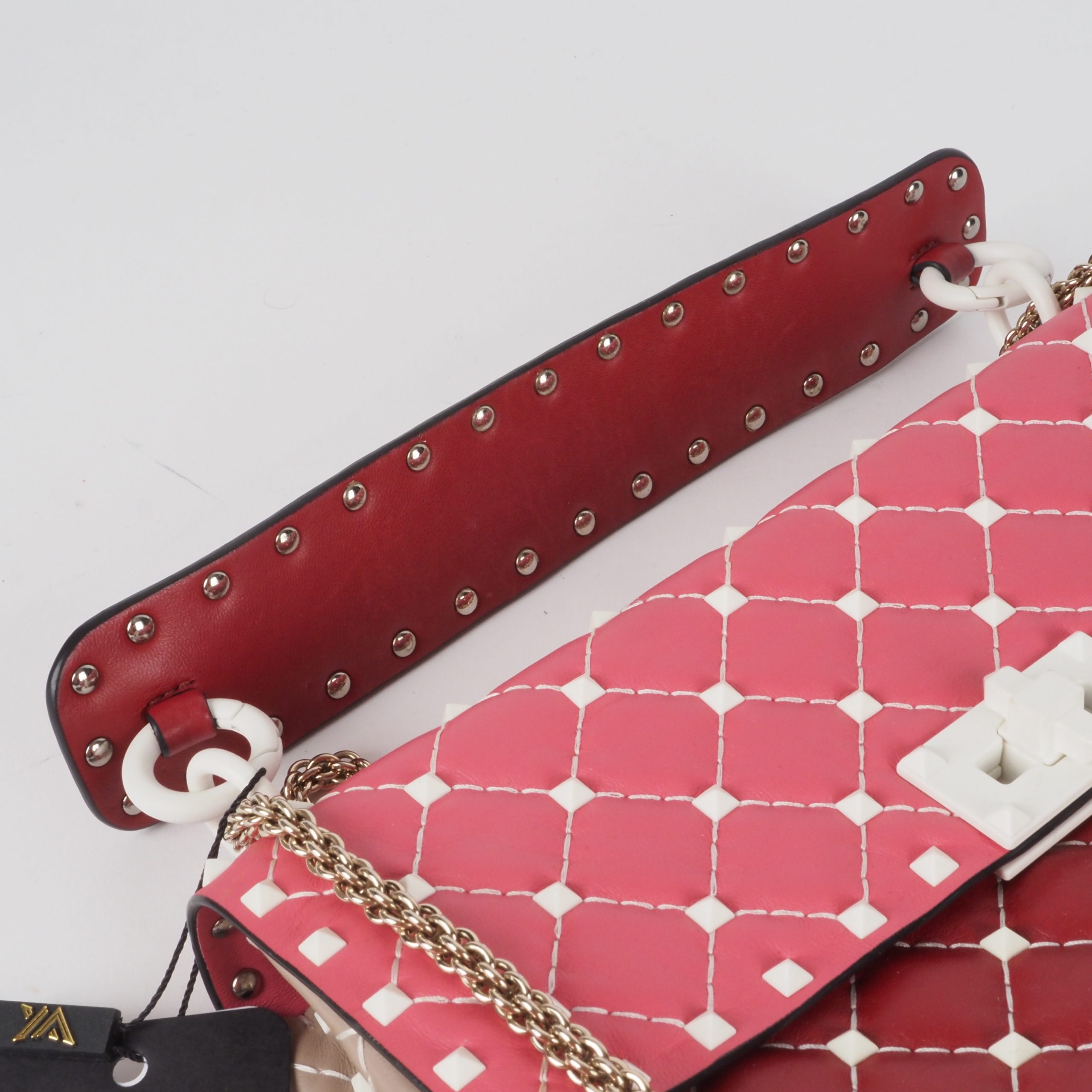 This exquisite special edition Valentino Garavani bag was crafted in Italy from fine leather. It features feather-light Rockstud bioceramic rivets and a twist lock. The chain is light gold-colored. The bag is in pristine, like-new condition, inside and out.