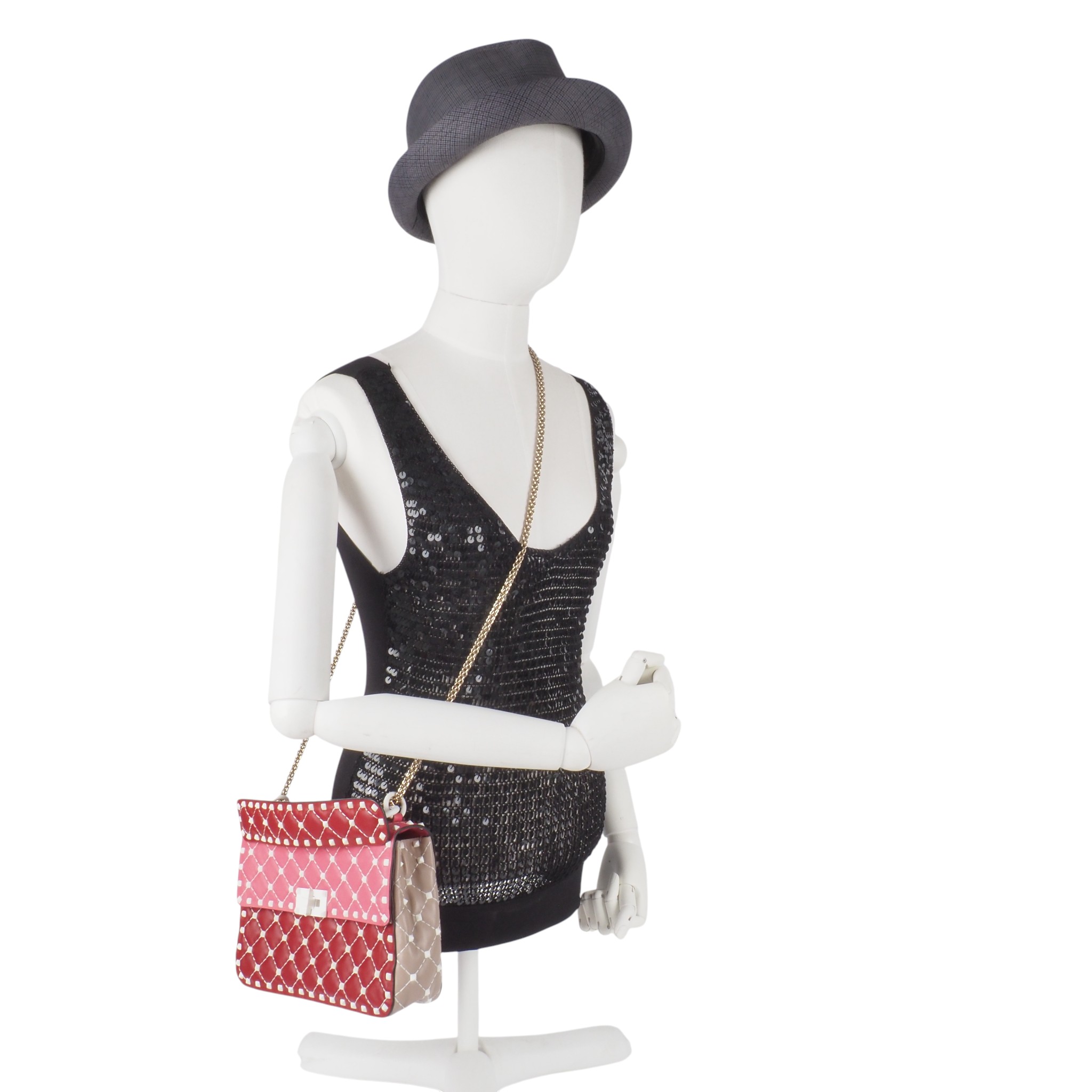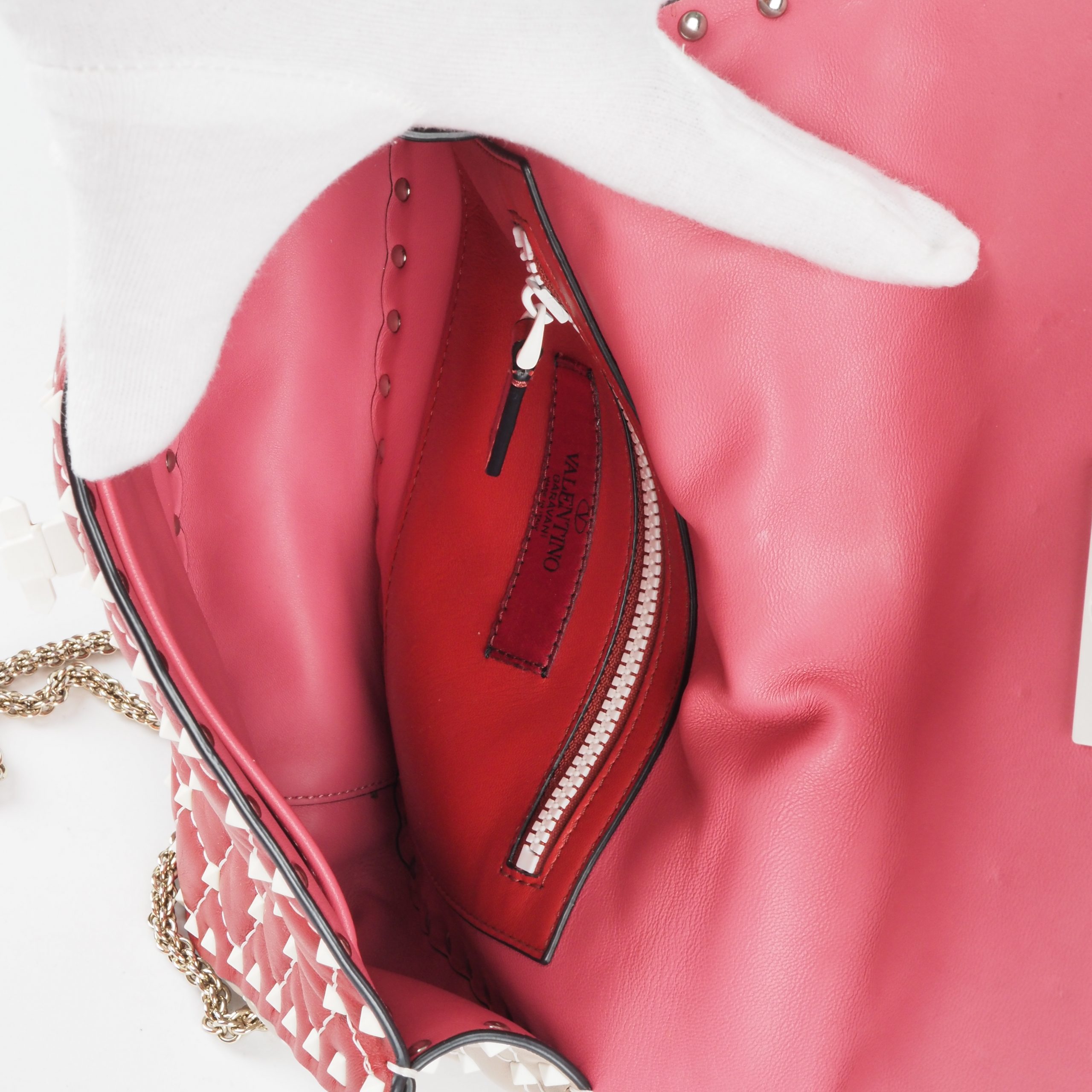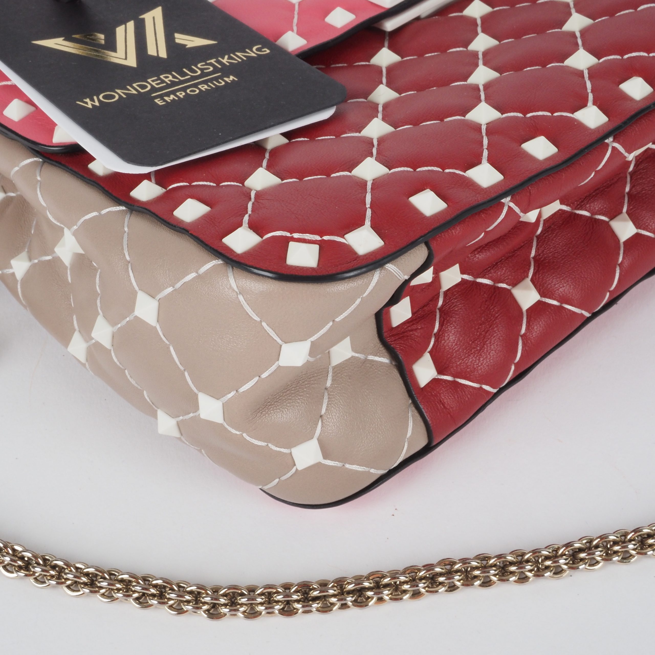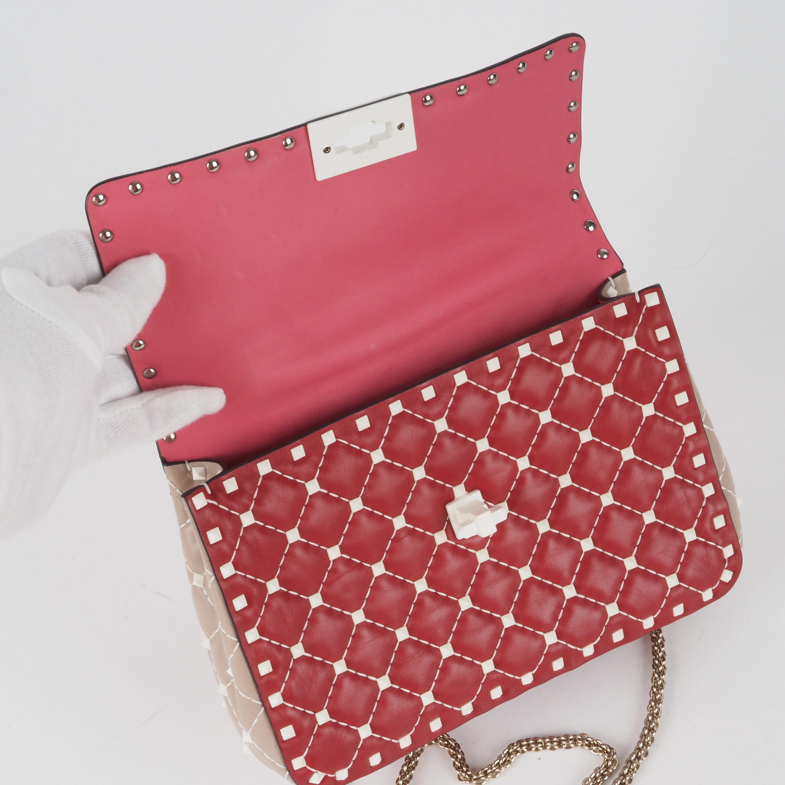 This exquisite special edition Valentino Garavani bag was crafted in Italy from fine leather. It features feather-light Rockstud bioceramic rivets and a twist lock. The chain is light gold-colored. The bag is in pristine, like-new condition, inside and out.