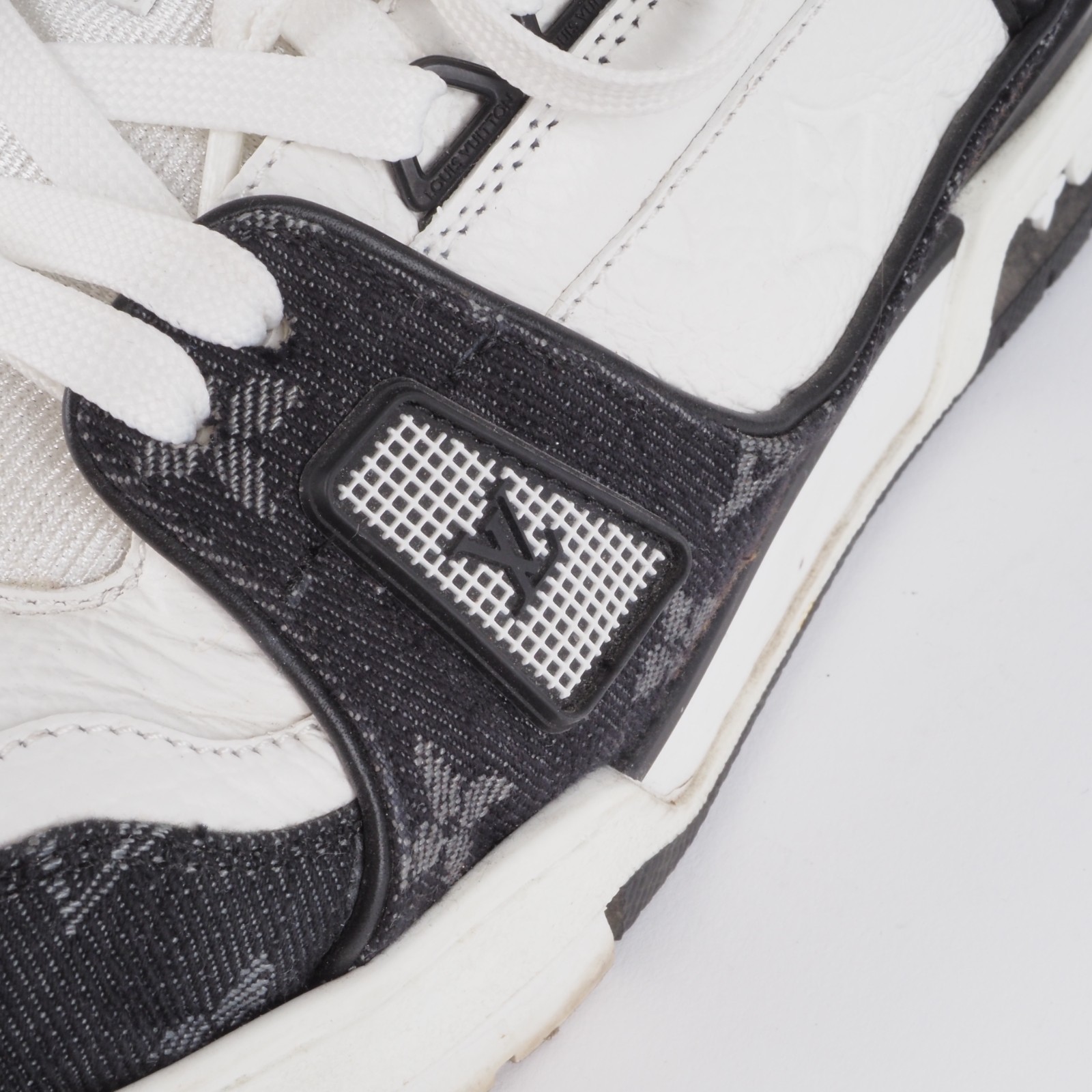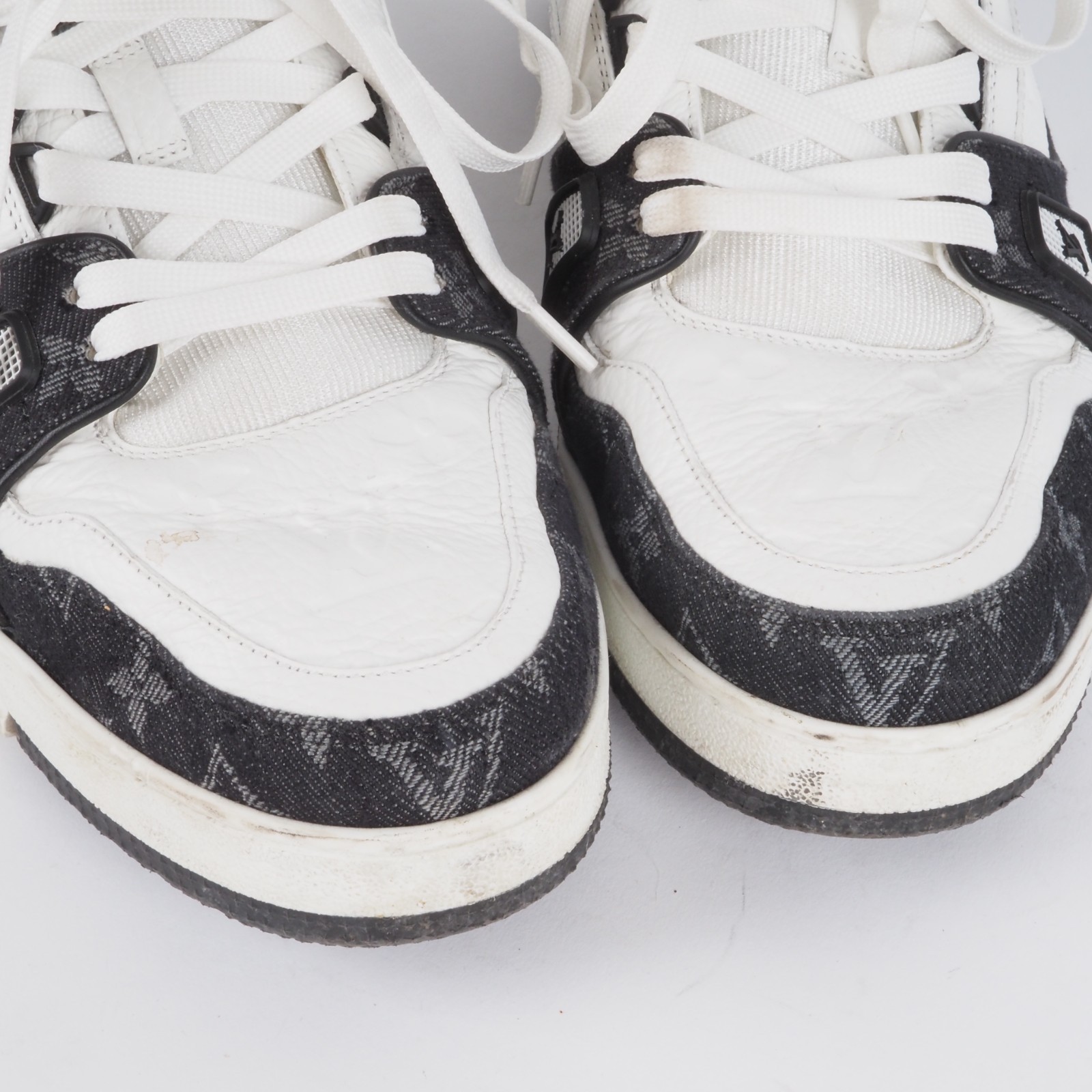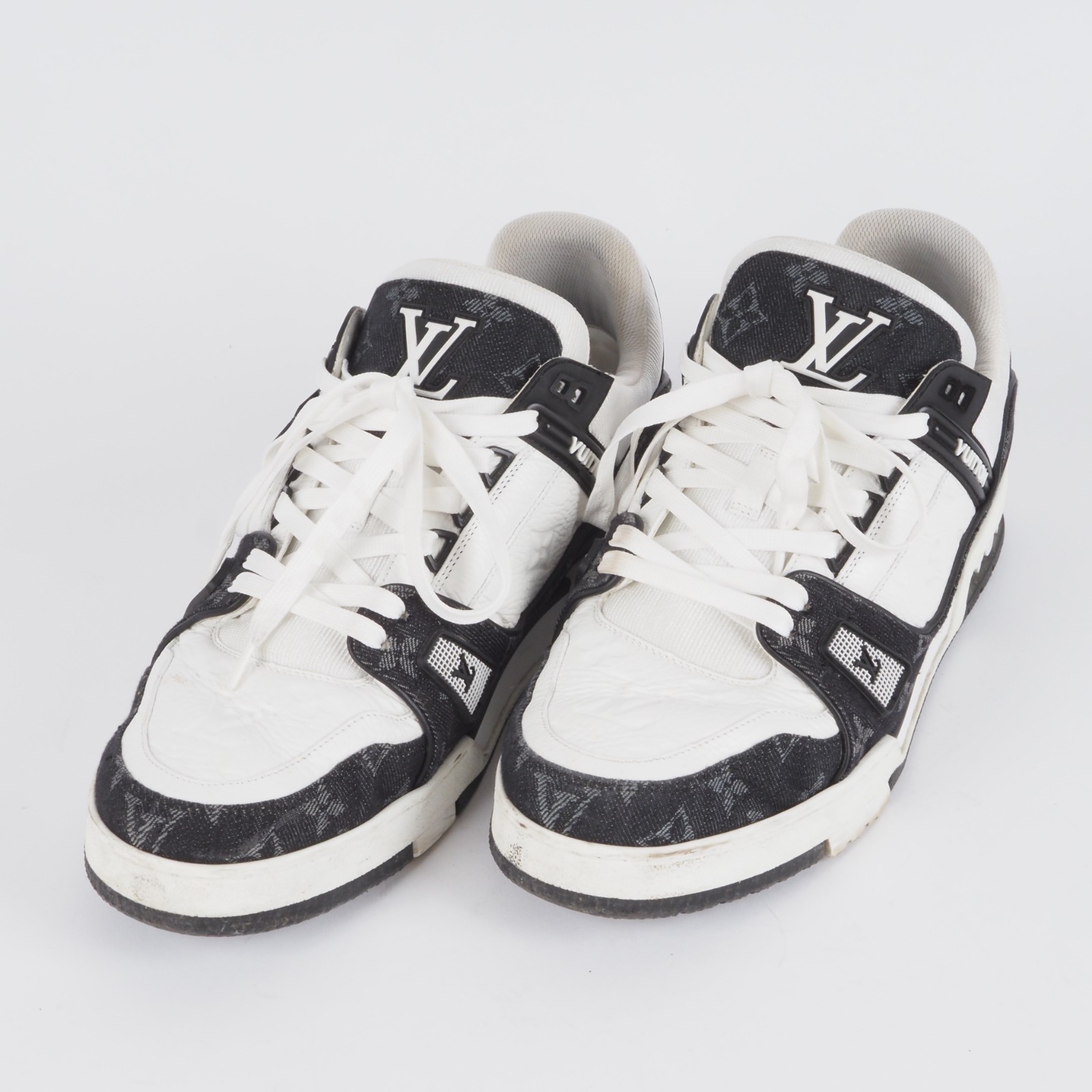 Der ikonische LV Trainer Sneaker wird diese Saison in einer Kombination von Monogram Denim und genarbtem Kalbsleder mit Monogram-Prägung neu interpretiert. Die sich abhebenden Farben und Materialien betonen die aufwendige Machart des von Basketball-Sneakern im Vintage-Stil inspirierten Designs.Hergestellt wurde in 2022 in Italien. Die Schuhe sind in gutem gepflegtem Zustand, wenig getragen. Ohne Flecken und Gerüche. Innen und außen sauber. Gr. 9 (fällt größer aus) entspricht also 44